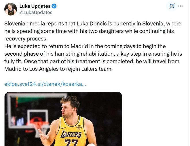湖人队一如既往支持东契奇的决定,认为在两轮疗程之间短暂回到斯洛文尼亚不仅不会影响东契奇复出的进程,反而有利于东契奇滋养他的心灵,湖人队深知头号球星的心理健康与身体健康同等重要,在斯洛文尼亚短暂休整后,东契奇将重返西班牙接受新一轮治疗,然后从西班牙直飞洛杉矶,预计将在一周内与湖人队汇合。