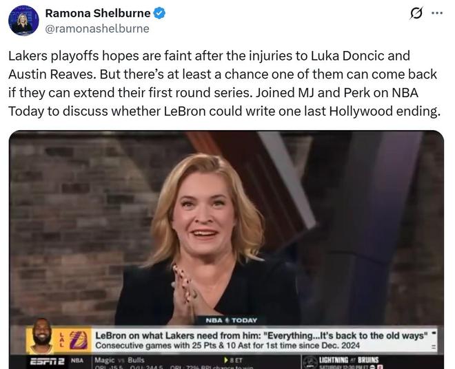 在常规赛进入最后一轮,季后赛即将开打之际,ESPN名记Ramona Shelburne在节目中谈及湖人伤病时,透露了东契奇与里夫斯的最新状况。